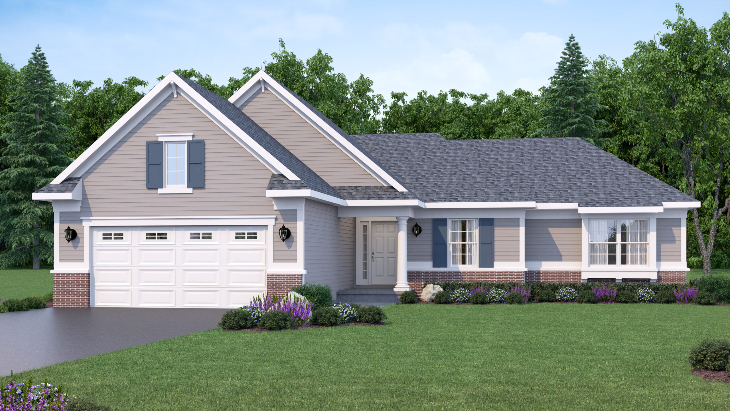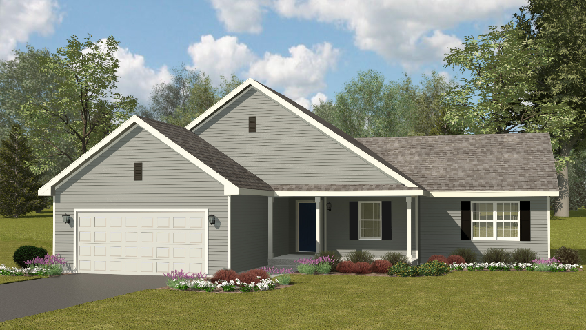 Exterior rendering of Sugar Maple floor plan in the exterior style of Shingle. 3 bed, 2 bath floor plan. Shingle